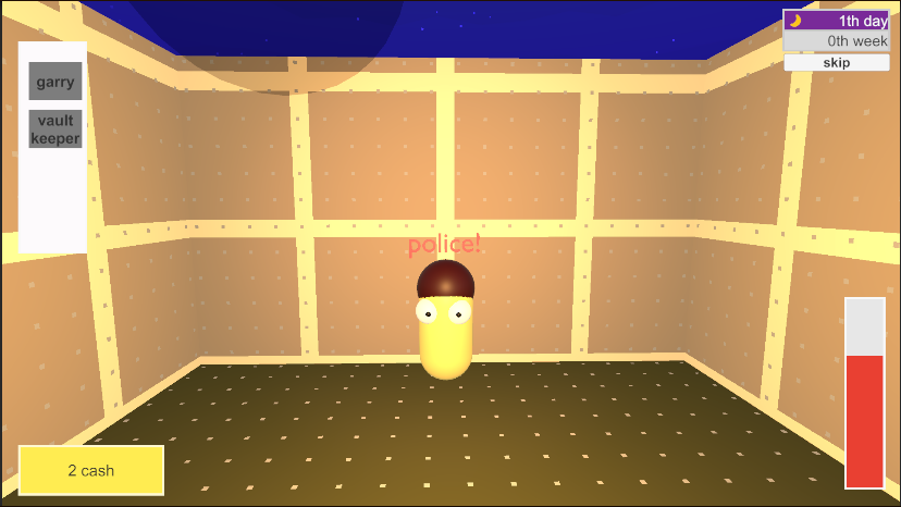 This is really neat! Unfortunately, I think my computer cuts off some of the hud, so I might be missing some aspects of the game, but the parts that I do get are really cool! It was very fun to break into the vault keeper’s house and steal all of his stuff. (I was caught, but it was worth it. Anything to satisfy my collecting urge.) I look forward to future updates if you continue development on this game! Thank you for an awesome gift! Merry Christmas!